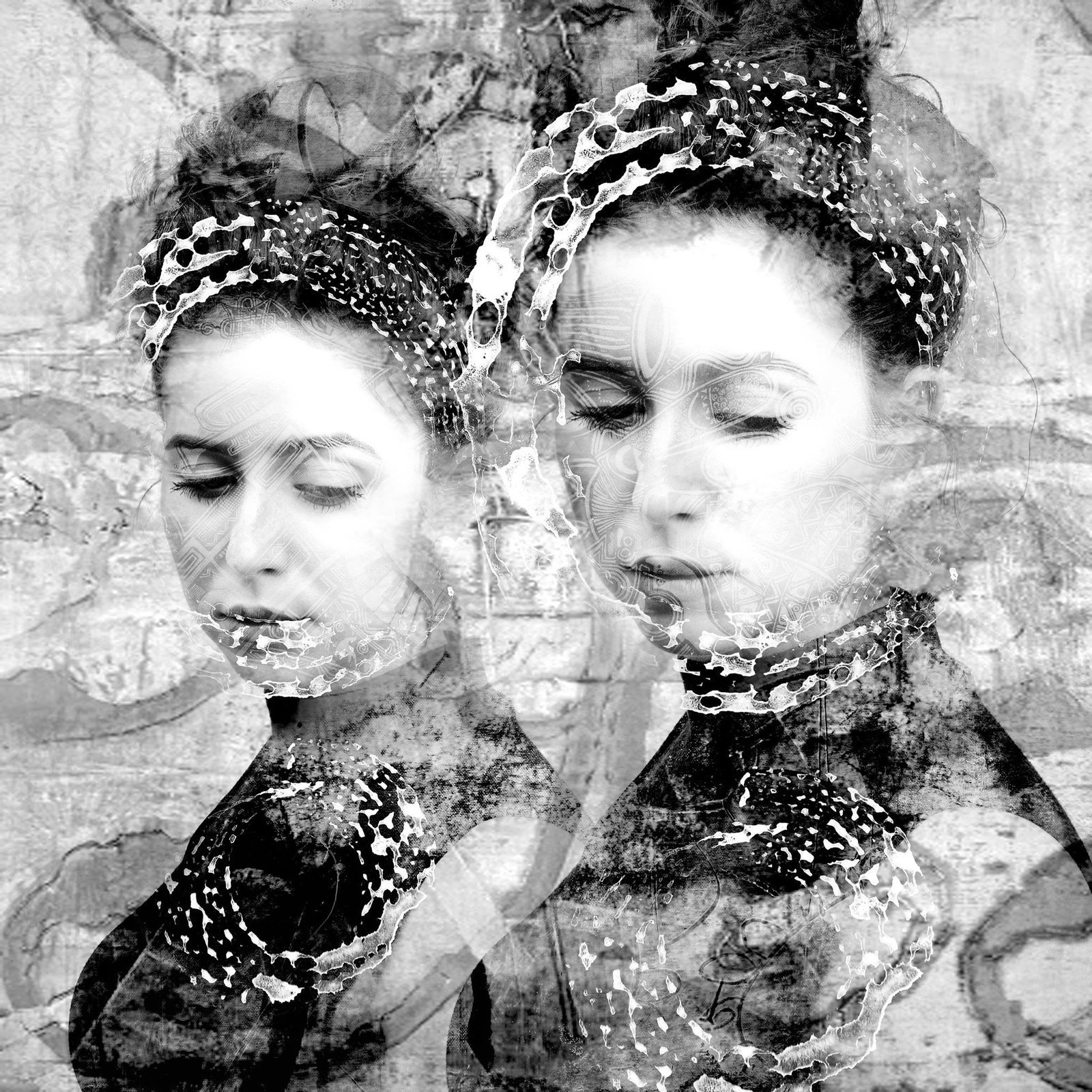 In TRACCE RIFLESSE, l’artista elabora un sofisticato sistema visivo basato sulla duplicazione e sull’intreccio materico, restituendo allo spettatore un’immagine che si situa tra introspezione e dissolvenza. Il soggetto, una figura femminile ripetuta specularmente, compare con gli occhi chiusi, assorta, come immersa in uno spazio di pensiero o in una memoria che non appartiene più interamente al presente. Le due presenze, identiche ma sfalsate, sembrano costituire due versioni di un’unica identità in dialogo silenzioso: l’io e l’eco, la presenza e la sua proiezione mentale. Tale riflessione sull’identità trova ulteriore forza espressiva nella superficie dell’immagine, attraversata da una trama di elementi grafici e materici – segni, lacune, texture organiche – che evocano erosioni, sovrascritture e sedimentazioni del tempo. Il trattamento visivo, che unisce fotografia, disegno digitale e manipolazione testurale, dissolve i confini tra figura e sfondo, in una poetica della fusione. Il volto e il corpo della donna sembrano diventare parte integrante del muro che li ospita, come se la pelle potesse assorbire la storia del luogo, o viceversa, come se fosse il mondo a scriversi sulla pelle. L’utilizzo del bianco e nero accentua il carattere atemporale e onirico dell’opera, privandola di riferimenti realistici e restituendo invece una dimensione metafisica: la figura è viva, ma sospesa in un altrove che ci è vicino ma non accessibile. Tracce riflesse è, in definitiva, un’opera che mette in scena il ritratto dell’invisibile, quel volto interiore che si forma nei silenzi, nelle ferite e nelle sovrapposizioni del vivere.