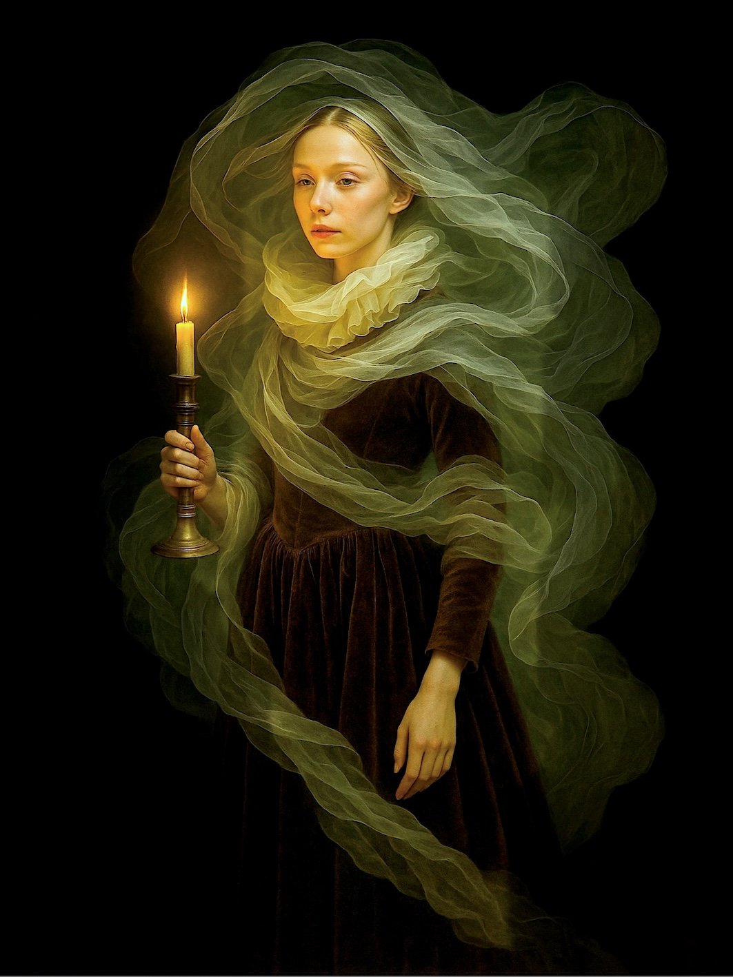 Sguardo di piccola luce Dal ciclo “Iconoclastica” di Luciano Di Gregorio Con Sguardo di piccola luce, il fotografo Luciano Di Gregorio ci accompagna in un viaggio silenzioso, fatto di ombre e chiarori, dove una giovane donna regge una candela come se fosse l’ultima scintilla di speranza in un mondo immerso nel buio. L’immagine colpisce per il suo equilibrio tra eleganza classica e sensibilità contemporanea. La modella, avvolta da veli che sembrano fumo o vento solidificato, emerge dal fondo nero come una figura sospesa nel tempo. Lo sguardo è calmo, quasi assorto, e invita lo spettatore a condividere un momento di intimità e contemplazione. La luce della candela non serve solo a illuminare la scena: diventa il vero cuore del racconto. È una luce piccola, sì, ma intensa, che sembra proteggere il volto della giovane e guidare chi osserva. È la metafora di un’umanità che resiste, di un pensiero che brilla anche quando tutto sembra spento. La scelta cromatica, sobria e raffinata, amplifica l’effetto emotivo. I verdi trasparenti dei veli e il marrone profondo dell’abito creano un contrasto delicato, quasi pittorico, che ricorda i ritratti rinascimentali e le nature morte fiamminghe. Ma qui non c’è nostalgia: c’è un dialogo tra passato e presente, tra sacro e profano, che rende l’opera viva e attuale. Il ciclo “Iconoclastica”, di cui questa fotografia fa parte, si interroga proprio su questo: cosa significa oggi creare icone, immagini che restino, in un’epoca di scorrimento veloce e consumo istantaneo? Con Sguardo di piccola luce, Di Gregorio sembra rispondere che l’arte può ancora fermarci, può ancora chiedere silenzio e attenzione. In definitiva, questa immagine è più di un ritratto: è un piccolo rito visivo, un invito a riscoprire il valore della luce — interiore ed esteriore — che ci accompagna anche nei momenti più oscuri.
