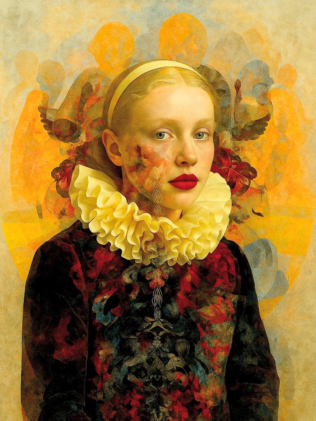 Nel nuovo capitolo del ciclo ICONOCLASTICA, Luciano Di Gregorio ci consegna Sensazioni Addosso, un’opera che si impone come un’ode alla fragilità e alla potenza dell’immaginario. La figura femminile, sospesa tra il reale e il visionario, si presenta come un’apparizione: volto diafano, labbra carminio, colletto rinascimentale che sembra respirare da solo. Ma è sullo sfondo – e sulla pelle stessa del soggetto – che avviene la vera rivoluzione percettiva: una folla di presenze, impronte di colore e ombre aranciate, si sovrappongono al corpo trasformandolo in palinsesto emotivo. Di Gregorio lavora come un regista dell’inconscio: ogni dettaglio diventa vibrazione psichica. Le pennellate digitali e fotografiche, fuse in un unico respiro, raccontano di un’umanità molteplice, stratificata, che abita la stessa carne. È come se il corpo ritratto fosse un campo magnetico capace di attrarre memorie, sogni e paure collettive. Il titolo Sensazioni Addosso suggerisce una fisicità emotiva: ciò che proviamo non resta astratto, ma ci veste, ci avvolge, ci trasforma. In questa chiave l’opera diventa specchio della contemporaneità, dove l’individuo è continuamente attraversato da flussi di immagini, notizie e stimoli sensoriali. L’impianto compositivo rimanda al ritratto fiammingo e al Rinascimento italiano, ma l’approccio è decisamente post-digitale: il tempo pittorico si scontra con la rapidità dell’elaborazione fotografica, generando un cortocircuito tra tradizione e futuro. Questo è il cuore di ICONOCLASTICA: non distruggere le icone, ma re-immaginarle, scardinarle dall’immobilità per restituirle vive, pulsanti. Di Gregorio invita lo spettatore a non fermarsi alla superficie estetica, ma a percepire l’opera come esperienza sensoriale totale. Sensazioni Addosso non si guarda soltanto: si sente, si indossa, si respira.