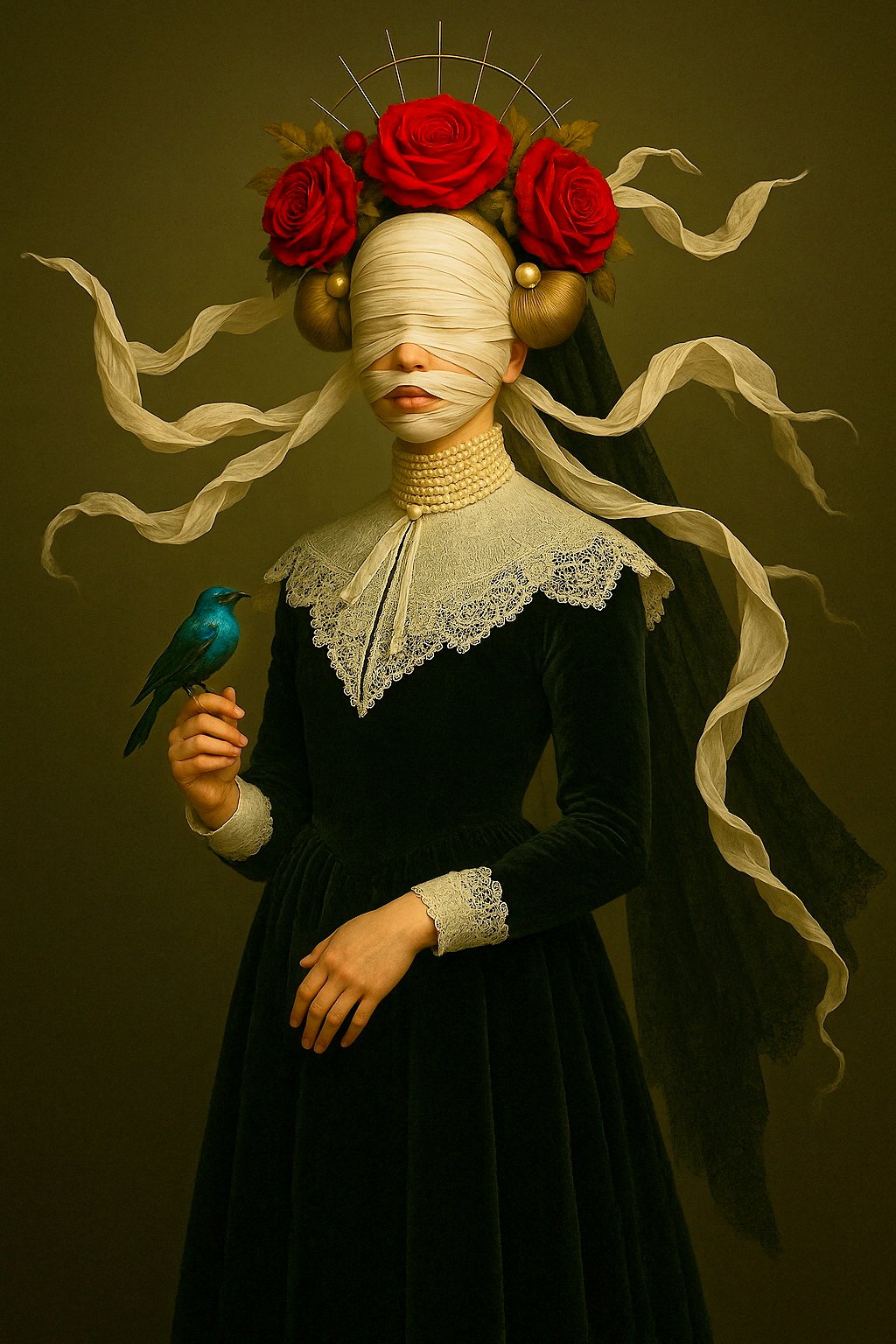 L’Ultima Veggente – L’Oracolo del Silenzio di Luciano Di Gregorio dalla serie Iconoclastica Nel panorama della fotografia contemporanea, “L’Ultima Veggente” di Luciano Di Gregorio si impone come un’opera di rara potenza simbolica, capace di fondere la tradizione pittorica fiamminga con un immaginario quasi surrealista. La composizione è una celebrazione dell’enigma: la figura centrale, avvolta in un abito di velluto scuro e impreziosita da un colletto di pizzo, richiama la ritrattistica seicentesca. Ma è la benda che ne avvolge il volto a trasformare l’immagine in un manifesto visivo dell’ignoto e dell’invisibile. Il titolo, L’Ultima Veggente, ci pone di fronte a una profezia silenziosa: l’oracolo è qui, ma la sua voce è muta, i suoi occhi sono coperti. In un’epoca in cui l’immagine è sovrabbondante e la parola urlata, Di Gregorio sembra invitarci a un ritorno al mistero, a un ascolto interiore che non passa dalla vista. I tre elementi dominanti – il rosso delle rose, il bianco delle bende e l’azzurro dell’uccello – costruiscono un linguaggio cromatico che racconta una storia di tensioni: eros e morte, purezza e sacrificio, libertà e prigionia. L’uccello, posato delicatamente sulla mano della veggente, rappresenta l’ultima possibilità di dialogo tra l’umano e il divino, un messaggero che forse canta una verità che la protagonista non può né vedere né pronunciare. La serie Iconoclastica a cui quest’opera appartiene si interroga sull’atto stesso del guardare e del rappresentare. Qui l’icona è decostruita, privata del volto, ma resa ancora più sacra attraverso il gesto rituale del bendaggio. Non è distruzione dell’immagine, ma sua trasfigurazione: Di Gregorio ci ricorda che la vera visione nasce dall’interiorità, e che la veggenza, oggi, è più che mai un atto di fede. “L’Ultima Veggente” non è un semplice ritratto: è una soglia. L’osservatore è chiamato a varcarla, a sostare nel silenzio, a interrogarsi sul proprio rapporto con l’invisibile. È in questo spazio sospeso che l’opera rivela la sua forza, trasformandosi da immagine in esperienza.