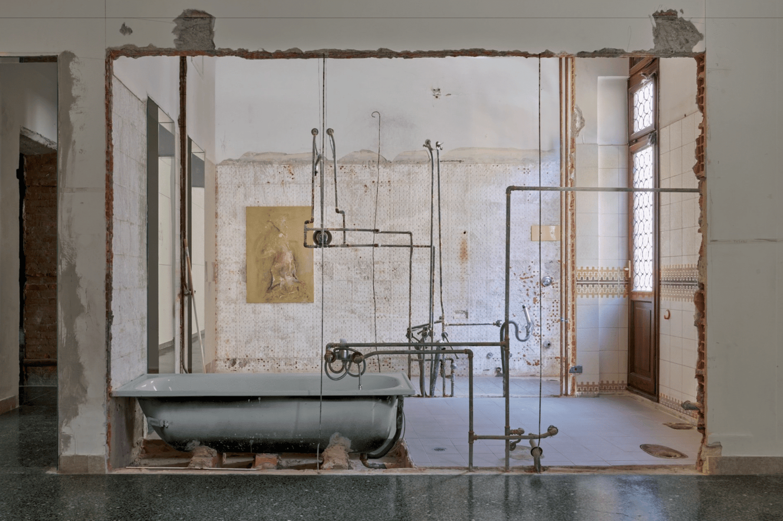 Un progetto site-specific che abbatte le barriere tra spazio, memoria e corpo. Curato da Hans Ulrich Obrist, l’intervento inaugura il nuovo spazio veneziano della Fondazione con una riflessione radicale sulla fragilità delle strutture – fisiche e simboliche – che regolano il nostro abitare. Un nuovo battito per Dorsoduro Venezia, settembre 2025 – Non un’inaugurazione tradizionale, ma un vero e proprio rito di passaggio. Così si presenta l’apertura della Nicoletta Fiorucci Foundation nel suo nuovo spazio a Dorsoduro 2829, nel cuore di Venezia. L’edificio, un tempo proprietà del priorato di Sant’Agnese e successivamente rifugio per giovani orfane, per poi trasformarsi in studio d’artista di Ettore Tito, si offre oggi in una nuova veste: un corpo vivente, vulnerabile e pulsante, grazie all’intervento dell’artista georgiana Tolia Astakhishvili (Tbilisi, 1974). La mostra, dal titolo to love and devour, è il primo capitolo di un programma espositivo che la Fondazione intende sviluppare nel tempo, sotto la direzione curatoriale di Hans Ulrich Obrist, una delle figure più influenti del panorama contemporaneo. Un’architettura smembrata e abitata Astakhishvili ha letteralmente abitato lo spazio per mesi, lavorandovi dall’interno, come un chirurgo che conosce il corpo che deve operare. Ha abbattuto muri, lasciato altri come tracce fantasmatiche, costruito nuove compartimentazioni che disorientano il visitatore. Il percorso non è segnato da cartelli o frecce, ma solo da una porta socchiusa e qualche fotocopia del comunicato stampa: un invito implicito a perdersi. L’allestimento si sviluppa in verticale, su più piani, come un labirinto di stanze erose. Muri scarnificati, tubature sospese, detriti sparsi, finestre velate da carta gialla che tingono l’ambiente di una luce calda e ambigua: tutto contribuisce a generare un senso di spaesamento. Al piano terra, un tavolo-oggetto incorpora posate e stoviglie come reliquie di un banchetto interrotto, mentre il bagno – spogliato di porte e pareti – diventa un luogo di esposizione radicale della vulnerabilità del corpo. Disegni come anatomie, architetture come corpi Nei disegni di Astakhishvili, presentati lungo il percorso, corpi e architetture si fondono: spalle e pavimenti si sovrappongono, arti si trasformano in travi, anatomie perdono centralità. L’edificio stesso sembra sottoposto a una vivisezione: pareti aperte come costole, organi mancanti, tubature esposte come nervi. È un gesto che non mira a ricomporre, ma a rivelare il collasso delle gerarchie che regolano lo spazio domestico. «L’edificio diventa un organismo vulnerabile, segnato da traumi – un corpo che respira, che vive e muore insieme a chi lo attraversa», spiega la curatela. Dialoghi con la storia dell’arte e del pensiero contemporaneo Il progetto trova un’eco nella ricerca di Pierre Huyghe, che con Timekeeper (1999/2001) sabbiò una parete della Vienna Secession rivelandone la stratificazione storica come i cerchi di un albero. Ma se Huyghe lavora per svelare i livelli temporali attraverso un gesto di rivelazione, Astakhishvili abita l’assenza, lascia le pareti mancanti e le divisioni aperte, esponendo l’instabilità come condizione permanente. Il parallelo si estende anche ad Alessandra Ferrini, che in Gaddafi in Rome (2022) utilizza la metafora anatomica per sezionare la memoria collettiva. In entrambi i casi, l’arte si fa strumento chirurgico, capace di scavare nella materia viva della storia.