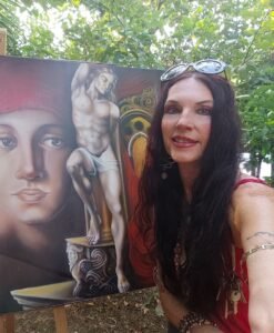 Giulianova. Una sera d’estate, nel giardino che custodisce il suo atelier, incontriamo Sandra Di Marcantonio, artista giuliese dalla creatività poliedrica: pittrice, musicista, autrice, spirito libero. I suoi quadri ci accolgono con un impatto immediato: campiture di rosso che si innestano nel bianco, bagliori d’oro che richiamano il sole e la trascendenza, forme classiche che tuttavia non smettono di vibrare di modernità.